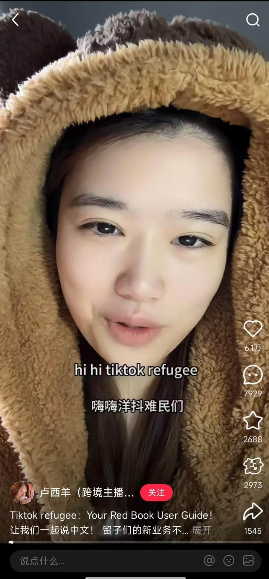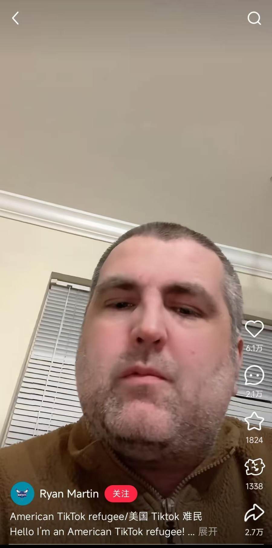一位名为“Ryan Martin”的用户在小红书上发视频,其用翻译软件语音称,“大家好,我叫瑞恩,是一名TikTok难民,美国政府正在禁止TikTok,所以我们正在寻找替代方案。”此外,他还表示,“美国人对中国的支持比你想象的要多,我们欣赏中国文化,包括三体和黑神话悟空,我们很抱歉打扰你(们),希望不必在这里待太久。”