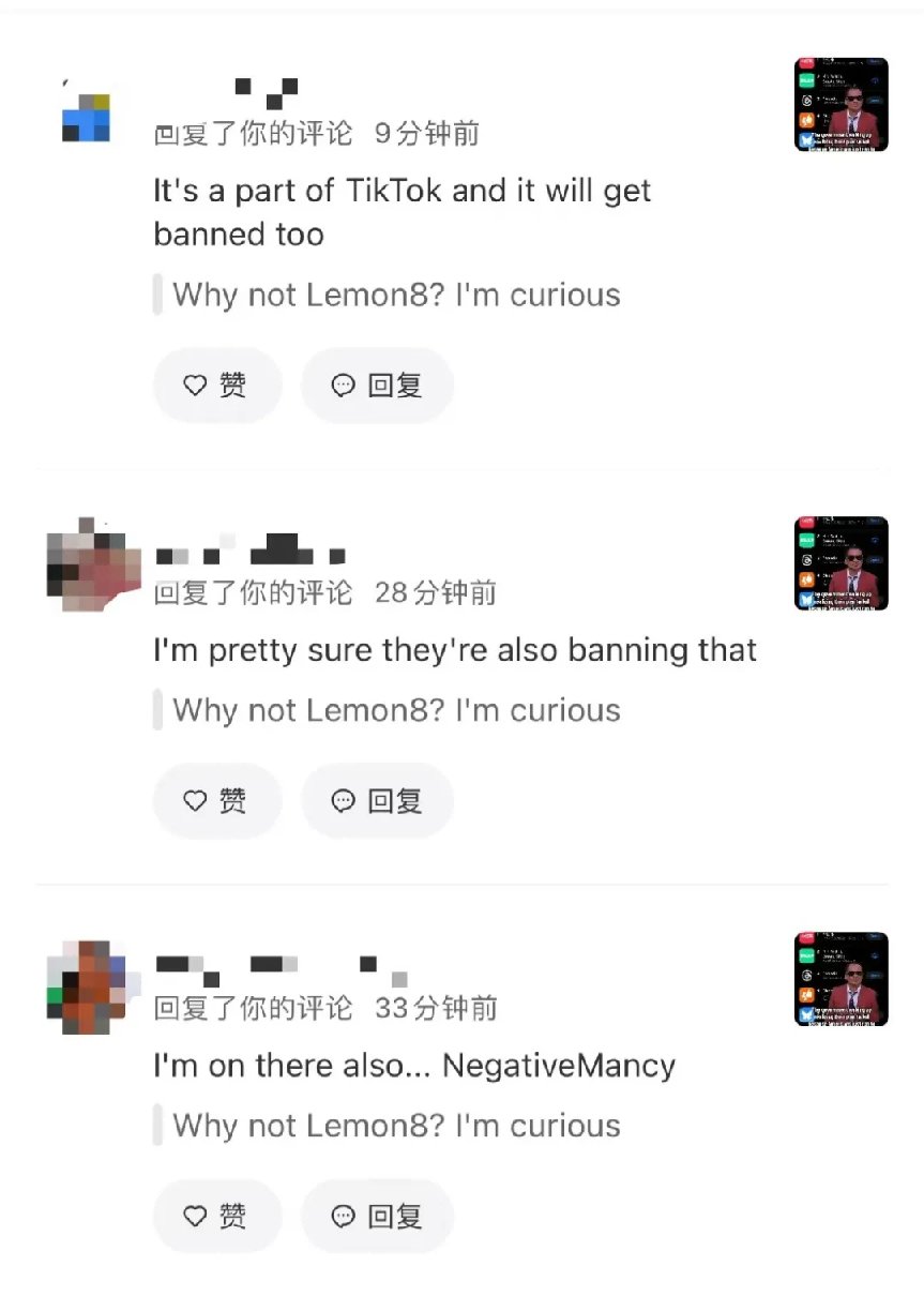 有TikTok难民在进入小红书时,解释了自己之所以会不选择Lemon 8作为下一个落脚地,是因为害怕TikTok被禁以后,同属于字节的Lemon 8也会被禁。