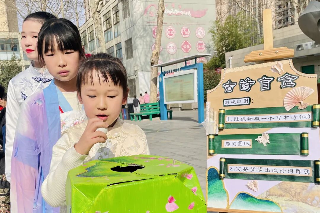 在区新建小学“春暖诗意浓”主题诗会现场,琴瑟和鸣与童声吟诵相映成趣。学生们身着传统服饰,或执卷吟咏《春夜喜雨》《咏柳》等春日诗篇,或三五成群体验蹴鞠、锤丸、抛环等传统游艺。非遗传承人现场教授古琴演奏技法,指尖流淌的《阳春》古曲与操场上的欢笑声交织,构建出“诗教润心,礼乐相成”的育人场景。