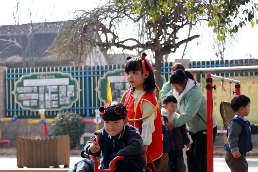 区实验幼儿园的操场变身神话剧场,一场萌趣十足的“魔童闹海”真人秀点燃春日激情。萌娃斜挎“乾坤圈”、身披“混天绫”、手持“火尖枪”,丸子头俏皮晃动,活脱脱一个威风“小哪吒”;另一边,大班同学共舞金色长龙蜿蜒游弋,化身灵动“敖丙真身”,龙首随着鼓点节奏精准完成“三点头”传统程式。随着铿锵锣鼓响起,“哪吒”与“敖丙”在操场中央欢乐“碰头”,“敖丙”所化长龙缓缓昂首,萌趣互动瞬间点燃全场,传统文化与现代童真碰撞出绚烂火花。
