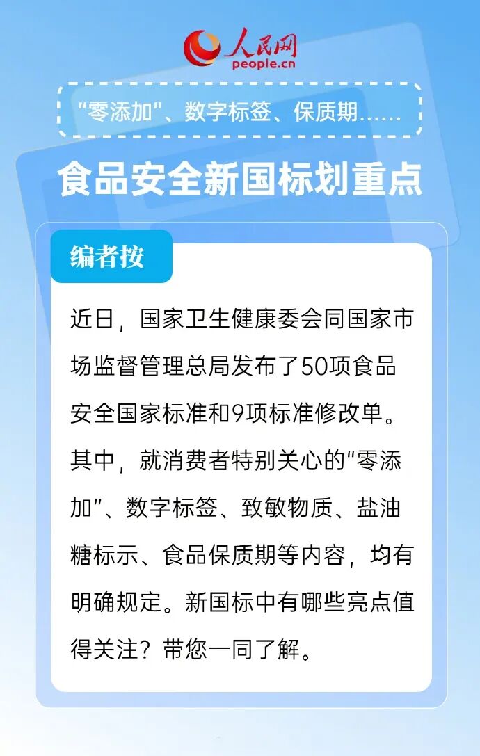 预包装食品应标示儿童减少盐油糖。近日,国家卫生健康委会同国家市场监督管理总局发布了50 项食品安全国家标准及9项标准修改单。大家关心的“零添加”、致敏物质、盐油糖标示、食品保质期等方面都有了明确规定。关乎你我“干饭”安全,一起了解!