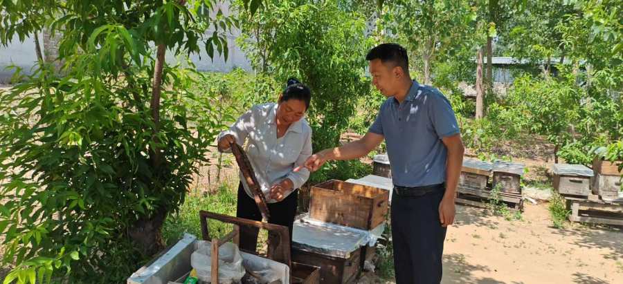 王鸿贤不仅在诗词创作上颇有成绩,还养了蜜蜂。她带着我们来到屋后的“养蜂场”,指着整齐摆放的蜂箱说:“这些都是我的‘小功臣’,当初养蜂也是为了治病,没想到现在成了我的一项事业。”她从最初的门外汉,通过不断摸索学习,查资料,请教养蜂师傅,把养蜂事业经营得有声有色。