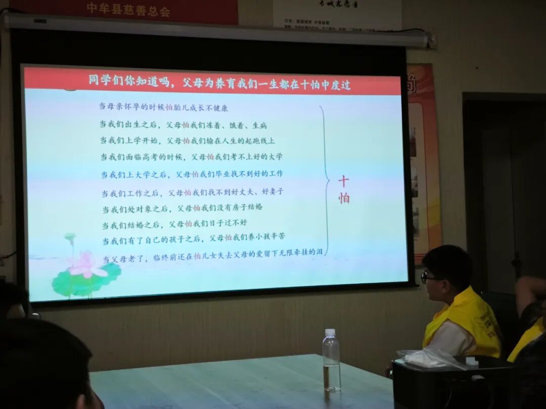 7月27日下午,中牟公益小天使“孝心少年”新八德教育培训在中牟县益奉社工服务中心“爱心妈妈”巾帼志愿服务队举行。李华老师为10余名公益小天使和家长讲了一节孝亲课,解答了“什么是孝亲”“为什么孝亲”“怎样孝亲”。