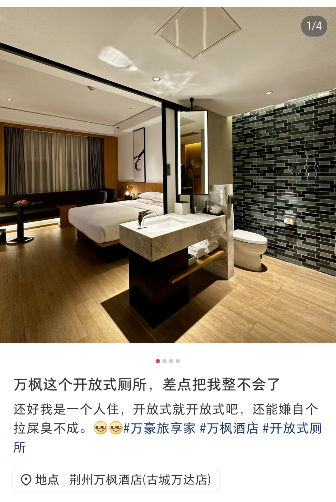 提到设计这一块,真心给万豪万枫提一个小建议:开放式厕所在国内消费者群体中的接受度并不算高,“在客厅拉屎”的吐槽声真实反映了用户的心声。万豪万枫酒店品牌需要在本土化方面再做更深入的调研。