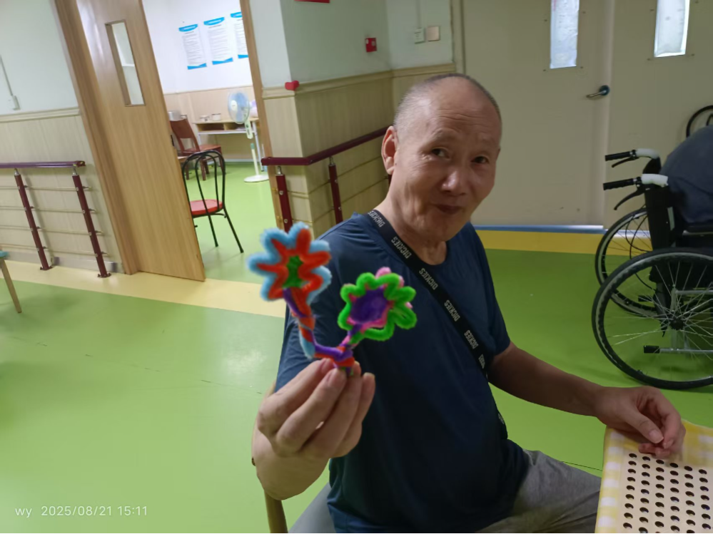 阳光温柔地倾洒在活动室,老人们围坐在一起,面前是一盒盒色彩缤纷的扭扭棒,这位老人手中捏着那柔软的扭扭棒,很熟练的上手将扭扭棒弯曲、缠绕、扭转。