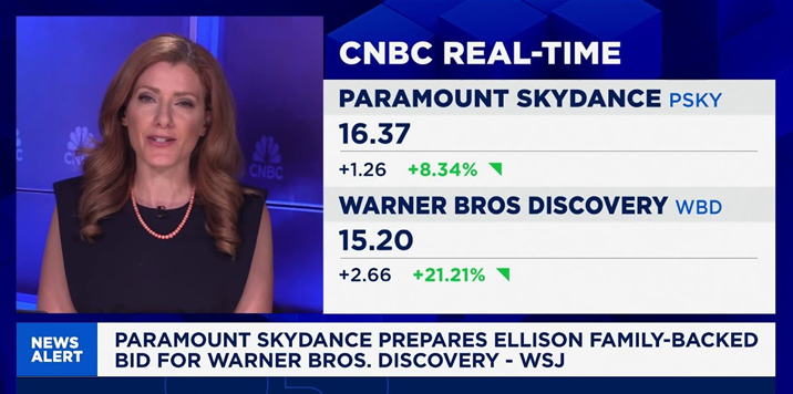 消息一出,市场反应剧烈。华纳兄弟探索股价在盘中一度暴涨30%,而派拉蒙股价也上涨了15%。