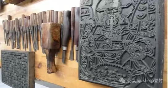 登封木版年画制作使用的部分刻版工具登封木版年画制作过程复杂,技艺要求十分严格,器具各具特色。制作年画时首先要创作年画线稿及色稿,选用产自嵩山本地的质地坚硬的山梨木,用单刀依线刻制,过稿后用油刷涂版面晾干,这样做的好处是方便雕刻,刷过油的版面比平时的版面雕刻起来进度要快五分之四。色版一般采用苹果木制作,过色稿有红、黄、蓝、紫四块色版,由淡至深印制色版,依浅到深最后印线版(也有先印线版,后印色版),直至整幅画完成。刻制年画所用的工具刻刀一般二十四把,此外还有刨子、刮刀、凿子、扁铲、木锥、棕子、木蘑菇等器具。