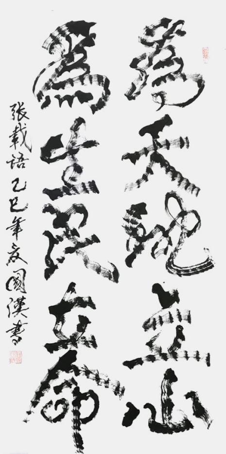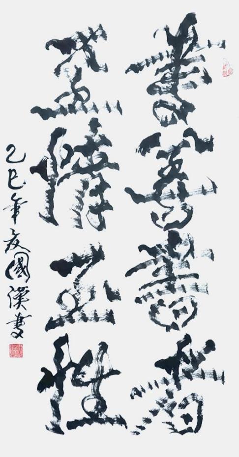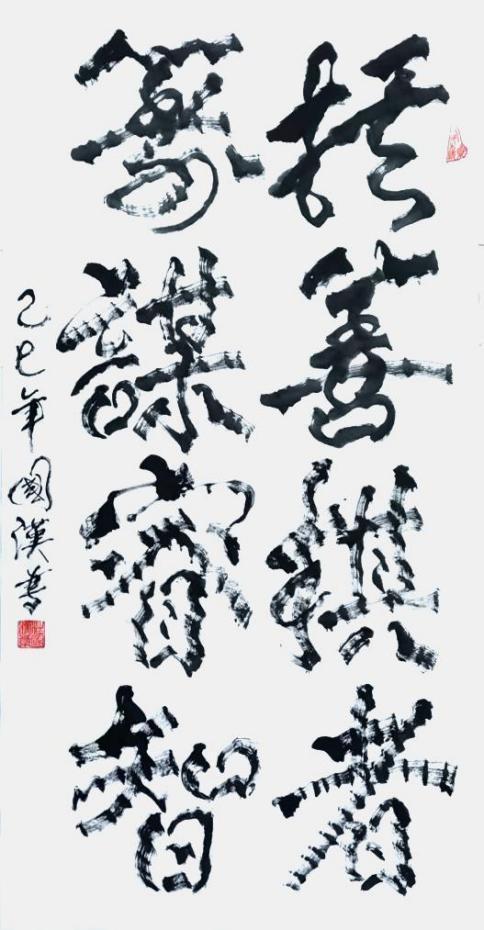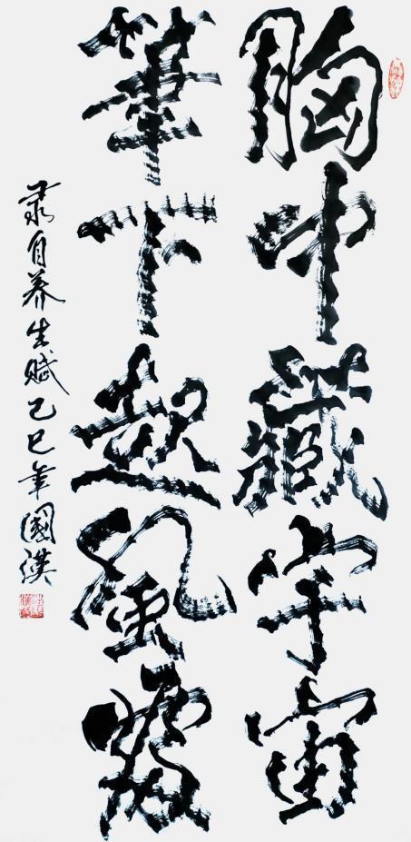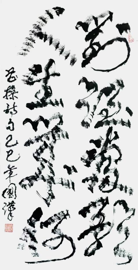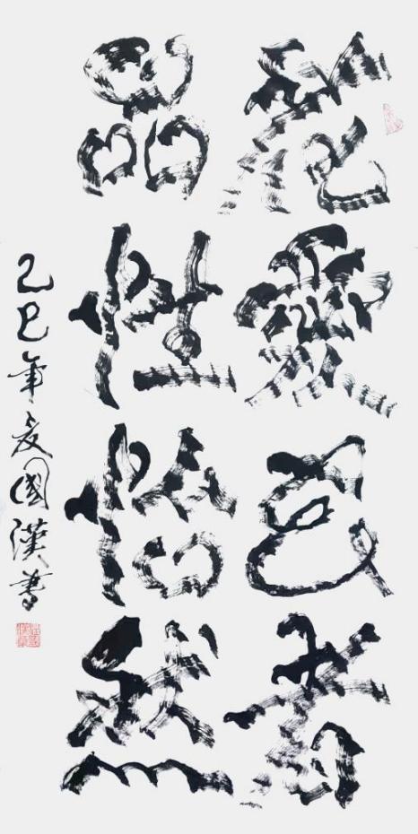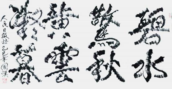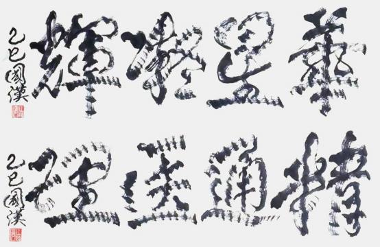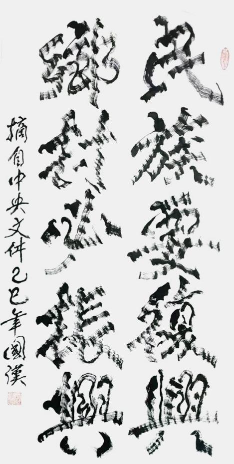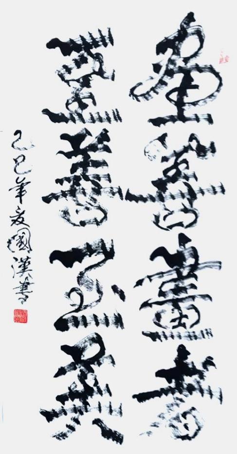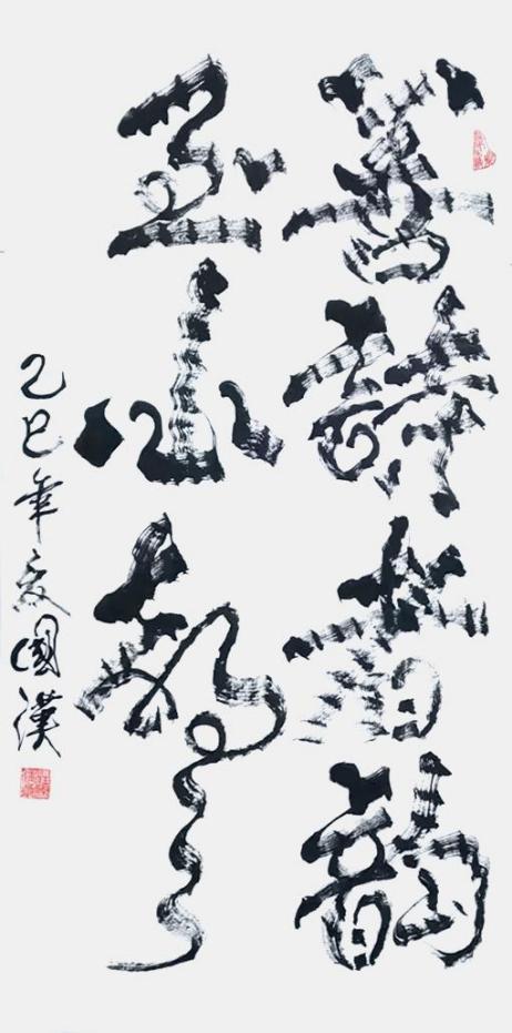 导言:“执笔写书法,也是通过笔法行运的节奏感来体现线条的生命感,非常单纯的线条,在心绪的引导下,能依照天地万物的存在节奏,换发成倾意而歌的生命动感,所以汪老师的书法线性活泼,动逸有品,没有一点儿匠气,加上墨生明辉,章法合韵,伸缩自如,大小得体,成为笔、墨、体、章的四重交响曲,写成了动人心扉的天歌妙韵。”这是文旅部文化产业司领导和专家对汪国汉书法线条的评论,更是对书法线条核心价值的准确定位。因为汪国汉的书法其线条变化多瑞,不但外形多变,其内部也是变化莫测。一个字中的同样笔画有变化,在同一幅作品中相同的字和不同的字中相同笔画也有区别,有象脊髓骨的,有的象虎猫尾巴的,有象锯齿的,有象竹杆的,有象山水的,有象小鸟小鸡的,动感很强似行云流水,有的似飘带随风飘扬。各种意象都有,看什么象什么。中央焦点人物栏目组评语称:“亮点很亮、特色突出、个性鲜明、虽是一幅静态画面,却凸现其动态韵律。令人精神振奋、拍案叫绝、叹为观止。每幅作品各具特色,变化万干,百看不厌。”