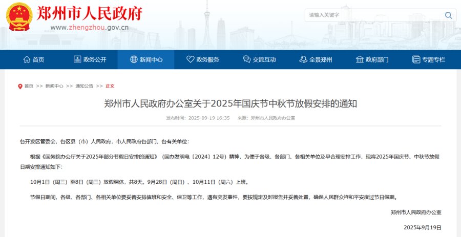 根据《国务院办公厅关于2025年部分节假日安排的通知》(国办发明电〔2024〕12号)精神,为便于各级、各部门、各相关单位及早合理安排工作,现将2025年国庆节、中秋节放假日期安排通知如下: