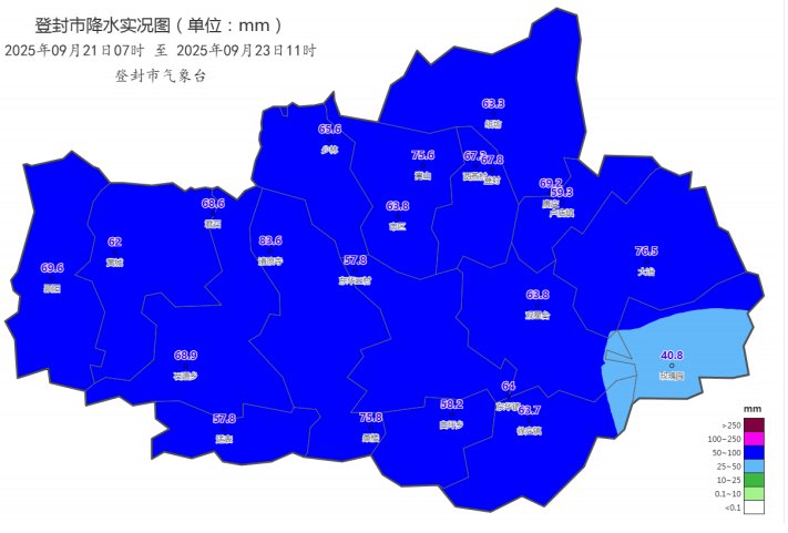 过程降水量:9月21日07时至23日11时,我市出现降水强度为中到大雨的降水天气过程。全市过程平均降水量65.6毫米,最大降水量出现在清凉寺站83.6毫米(图1、表1)。最大小时雨强8.2毫米,出现在卢店站(23日03时-04时)。
