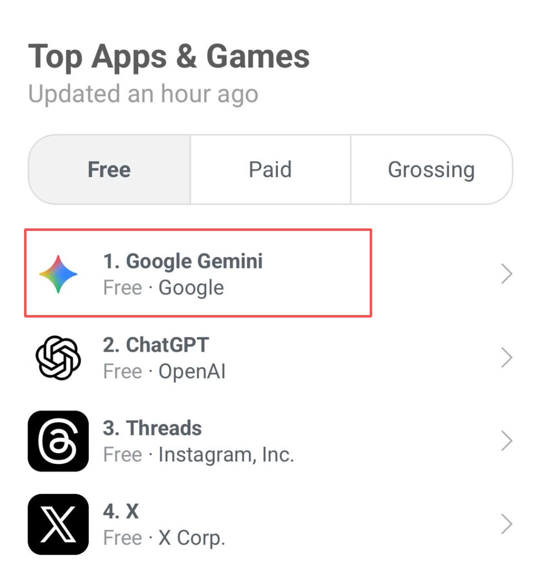 疯狂的流行带来了另一个好处,就是直接带动了Gemini App的用户增长。在短时间内,Nano Banana为Gemini App带来了超过1000万新用户。而在前不久,Nano Banana更是帮助谷歌Gemini超越了霸榜苹果应用榜很久的ChatGPT。