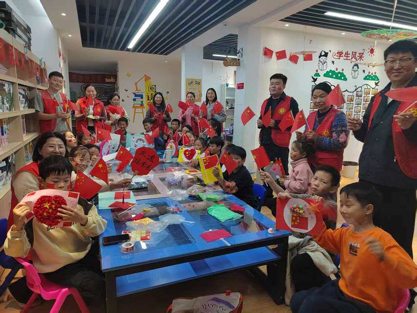 活动现场,国旗、气球等元素洋溢着节日的喜庆,孩子们的欢声笑语进一步营造出国庆欢快、浓厚的节日氛围。活动伊始,社区志愿者用通俗易懂的语言讲述了国庆节的意义,引导孩子们感受祖国的发展与强大,在他们幼小的心灵中播撒下爱国的种子。随后,手工制作环节正式拉开帷幕。在志愿者的耐心指导和协助下,孩子们兴致勃勃地投入到创作中。他们用五彩的卡纸、闪亮的丝带、软软的黏土,认真制作起来:一面面鲜艳的五星红旗在他们手中诞生,承载着对祖国最崇高的敬意;一幅幅精美的图画,展现了孩子们对美好未来的无限憧憬……他们专注的眼神、认真的姿态,以及完成作品后脸上洋溢的骄傲与喜悦,无不彰显着新时代少年儿童积极向上的精神风貌。