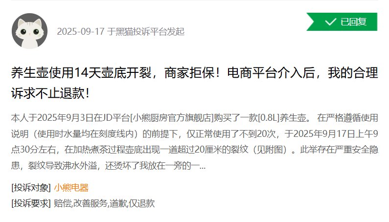 9月17日,有消费者投诉称,在官方旗舰店购买的小熊养生壶,在严格遵循使用说明的前提下,仅使用了不到20次,壶底就出现了一道超20厘米长的裂纹。