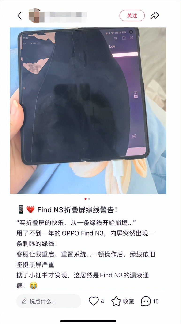 在小红书平台上,一些用户也分享了自己的经历,直指OPPO Find手机的绿线问题和售后服务问题。一位网友在小红书上表示,“用了不到一年的OPPO Find N3,内屏突然出现一条刺眼的绿线!”该网友表示,客服让其重启、重置系统……,但一顿操作后,绿线依旧存在,黑屏严重。