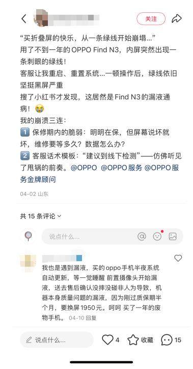另一位小红书用户则在下方留言称,“我也是遇到漏液,买的oppo手机半夜系统自动更新,等一觉睡醒前置摄像头开始漏液,送去售后确认没摔没碰非人为导致,机器本身质量问题的漏液,因为刚过质保期半个月,要换屏1950元”。