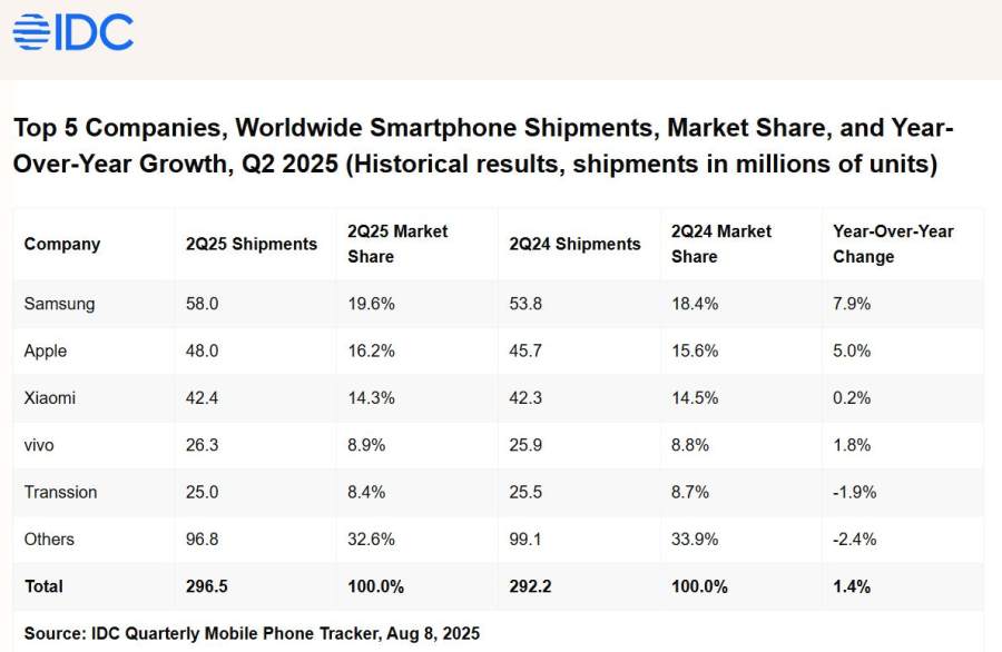 然而,根据IDC的数据显示,2025年第二季度,全球智能手机出货量为2.965亿部,同比增长1.4%。其中,三星以58百万部的出货量占据了19.6%的市场份额,继续稳居全球第一。而苹果紧随其后,出货量为48百万部,市场份额为16.2%,同比增长了5%。与此形成对比的是,OPPO的出货量未能进入前五名。