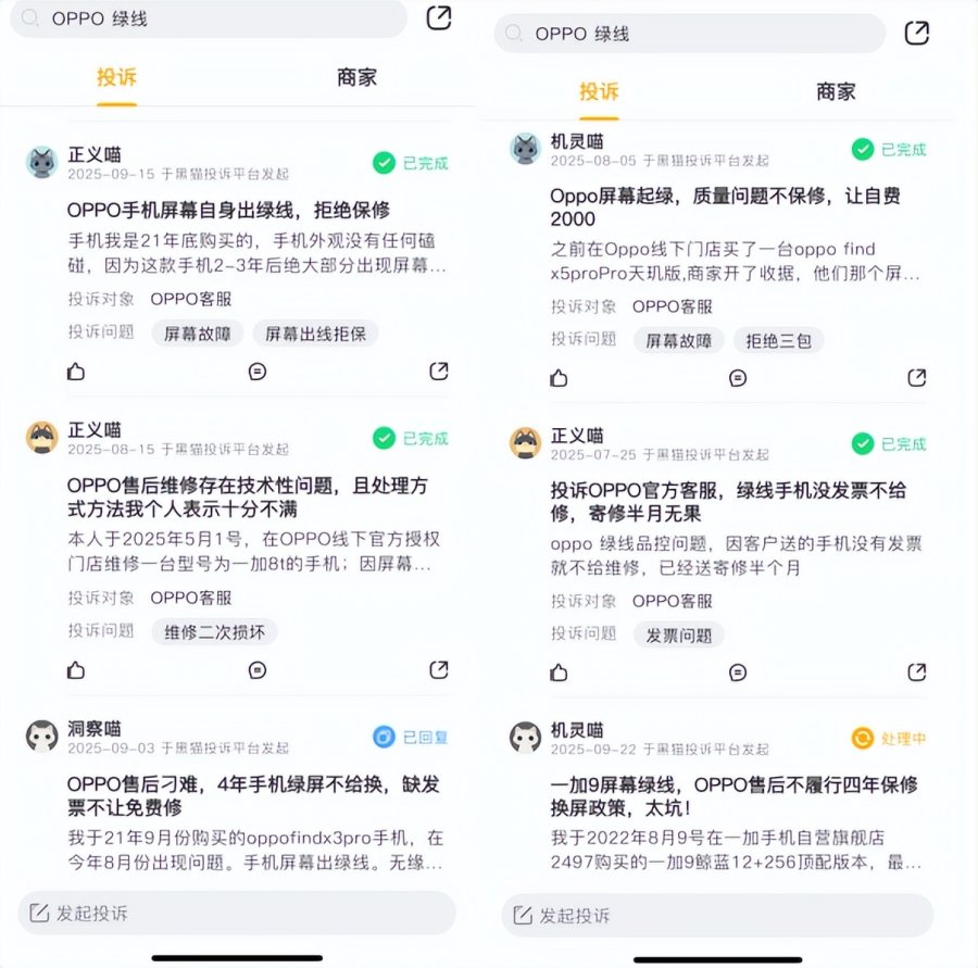 根据黑猫投诉平台相关投诉显示,多位消费者反馈了OPPO手机屏幕出现绿线的情况,且一部分用户未能在售后中获得及时且满意的解决方案。