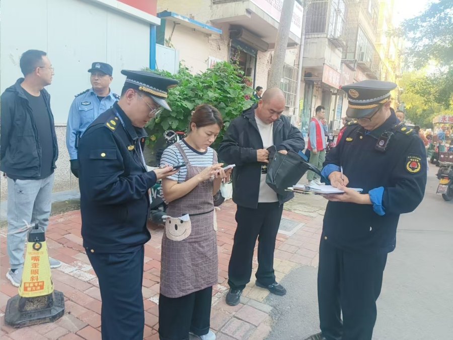 联合执法现场,各部门各司其职又密切配合。面对占道经营的摊贩,执法队员秉承文明执法的准则,耐心向商贩讲解占道经营的危害以及相关法律法规,对主动整改的商贩细心引导,对于多次占道经营、拒不整改的商贩依法依规进行行政处罚。