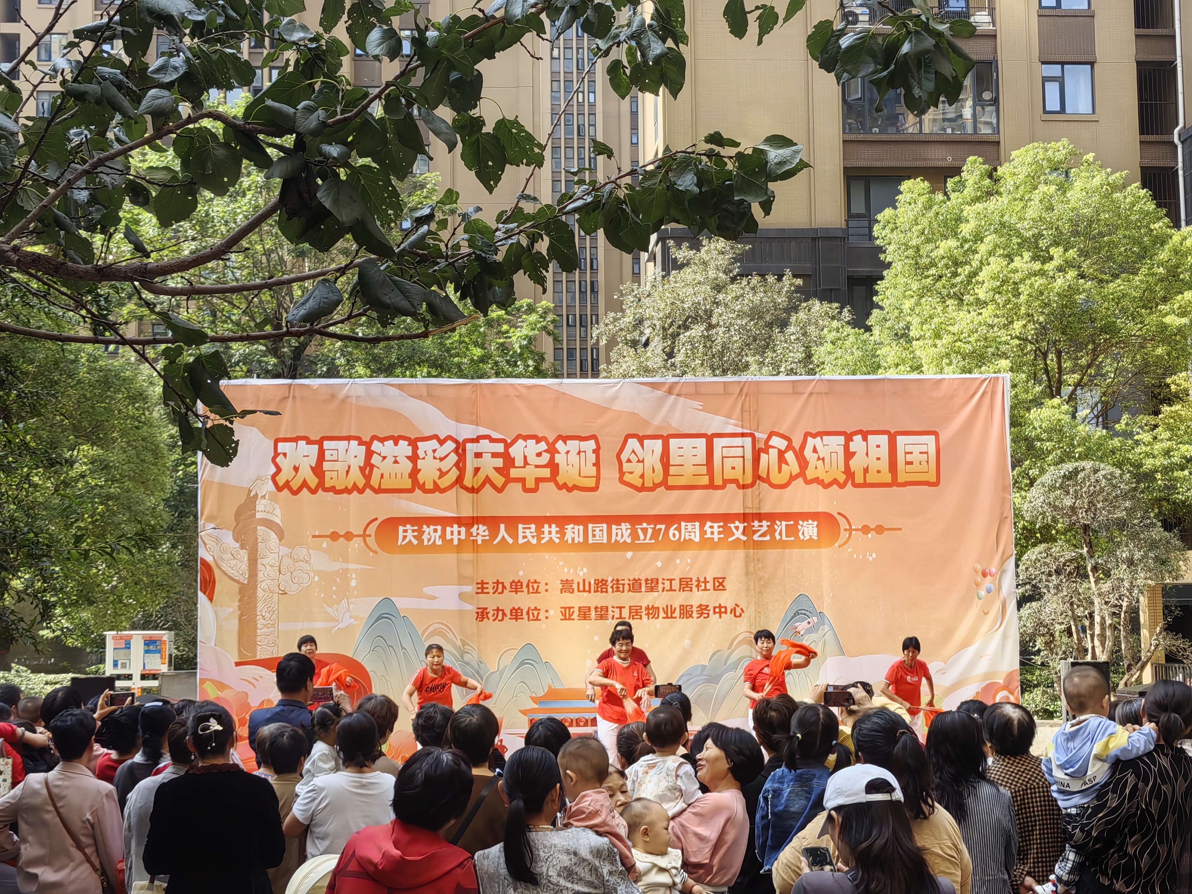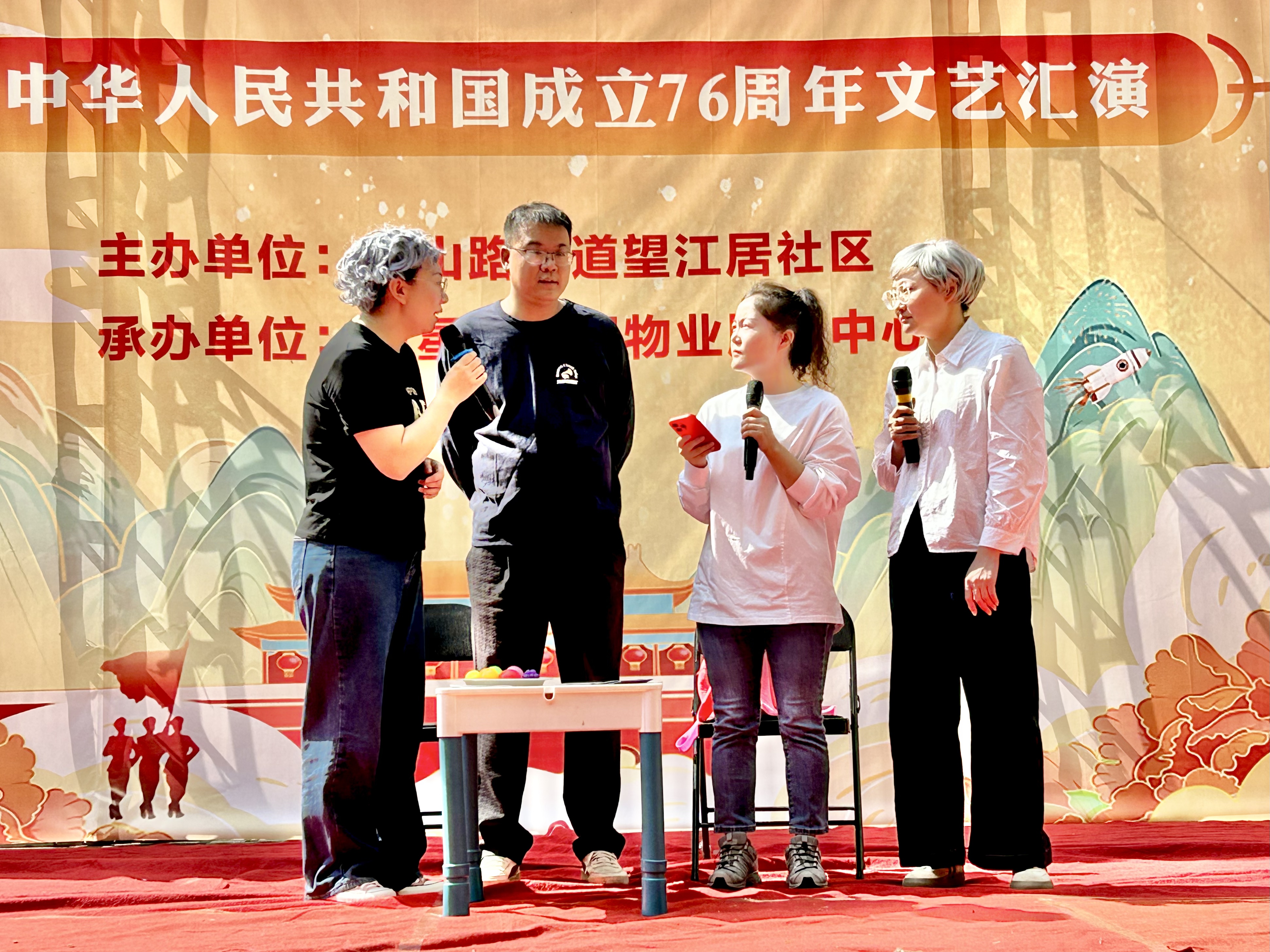 汇演现场,社区社会组织队伍展现出蓬勃活力:“以歌会友”银发合唱团以《我和我的祖国》唱响爱国情怀,舞蹈队的《五星红旗》舞蹈传递奋进力量,太极队带来刚柔并济的太极表演,物业朗诵《国庆颂歌》抒发赤子心,望江居戏曲队演绎的豫剧《让神州大地国泰民安》彰显传统文化魅力。此外,防诈知识问答、趣味抢板凳等互动环节穿插其间,进一步拉近邻里距离,营造了“人人识诈、全民反诈”的浓厚氛围。