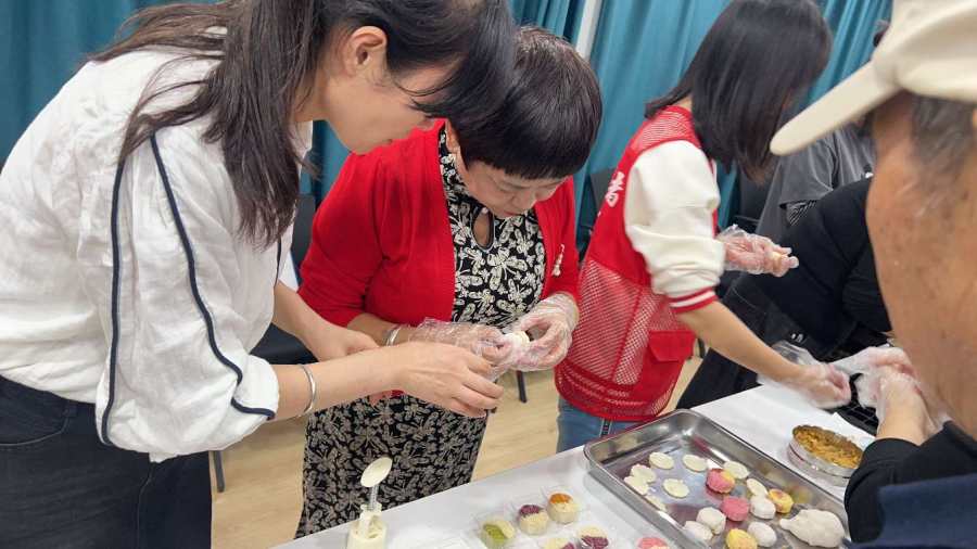本次活动特别设置了“月满中秋”手工月饼制作环节。在面点师傅和志愿者的悉心指导下,大家纷纷动手体验。从和面、包馅到压模、成型,居民们互相交流技巧好奇地尝试每一个步骤。当印有“福”、“团圆”等吉祥图案的月饼在手中诞生时,现场充满了欢声笑语和成就感。亲手制作的月饼,不仅承载着节日的甜蜜,更蕴含着一份深厚的情谊,让大家在劳动与协作中深刻体会到中秋“团圆”的文化内核与“分享”的邻里温情。