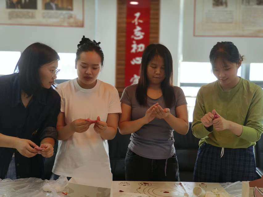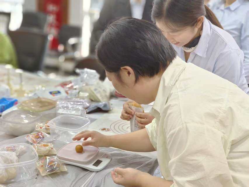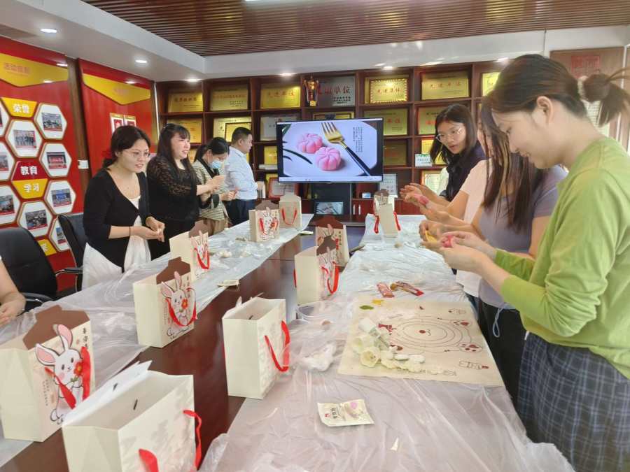 紧接着是最让人期待的手工做月饼环节,彻底点燃了现场的欢乐氛围。桌上早已摆满了冰皮粉、各色馅料、精致模具,老师先手把手演示制作流程:揉面团要揉到光滑不粘手,包馅料要捏紧不漏馅,压模具时要力度均匀……看着老师手中很快成型的玉兔、花好月圆、卡通动物造型月饼,大家跃跃欲试。动手操作时,现场瞬间变成了“创意工坊”:有人小心翼翼地捏着面团,生怕馅料“跑出来”;有人和同伴互相“取经”,调整模具的角度;还有人脑洞大开,尝试将面团用多种颜色混染,做出独一无二的“专属月饼”。不一会儿,一个个造型可爱、色彩鲜亮的冰皮月饼摆满了桌面,大家拿着自己的“作品”拍照留念,脸上满是成就感。“第一次亲手做月饼,不仅好玩,还特别有中秋的仪式感!”人社局的一位职工笑着说,要把做好的月饼带回家,和家人分享这份节日的喜悦。