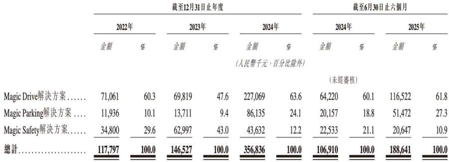 作为对比,魔视智能的Magic Safety解决方案收入则从2022年的3480.0万元猛增至2023年的6299.7万元,占比分别约为29.6%、43.0%。而2024年度,该业务贡献的收入约为4363.2万元,同比减少30.7%,占比骤降至12.2%,2025年上半年进一步降至10.9%。