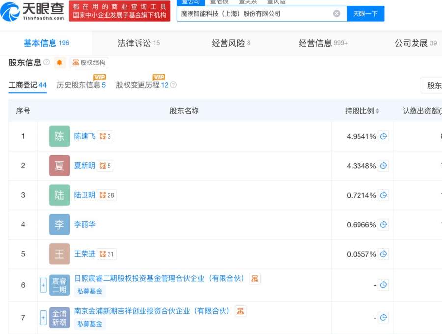 天眼查App信息显示,魔视智能成立于2015年8月。目前,该公司的注册资本为1690.9437万元,法定代表人为YU ZHENGHUA(虞正华),主要股东包括陈建飞、夏新明、陆卫明、李丽华、王荣进等。