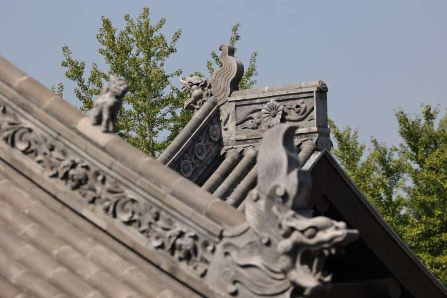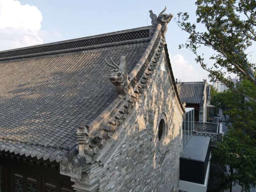 错落有致的正脊花脊,栩栩如生的脊兽、垂脊兽在这里随处可见。但是,建设初期脊兽图纸均为参考尺寸,与传统古建脊兽尺寸关系不对应,如何做好二次创作和设计深化成了中建八局团队面临的一大难题。团队成员不断翻阅当地典籍搜罗旧照片、建立脊兽资源库使用电脑模拟远、中、近三种观赏视角推敲尺寸,再有序放大,并邀请非遗传承人团队进行手工泥胚制作,最终实现了实脊花纹连贯流畅、脊兽与建筑风格完美搭配的效果。