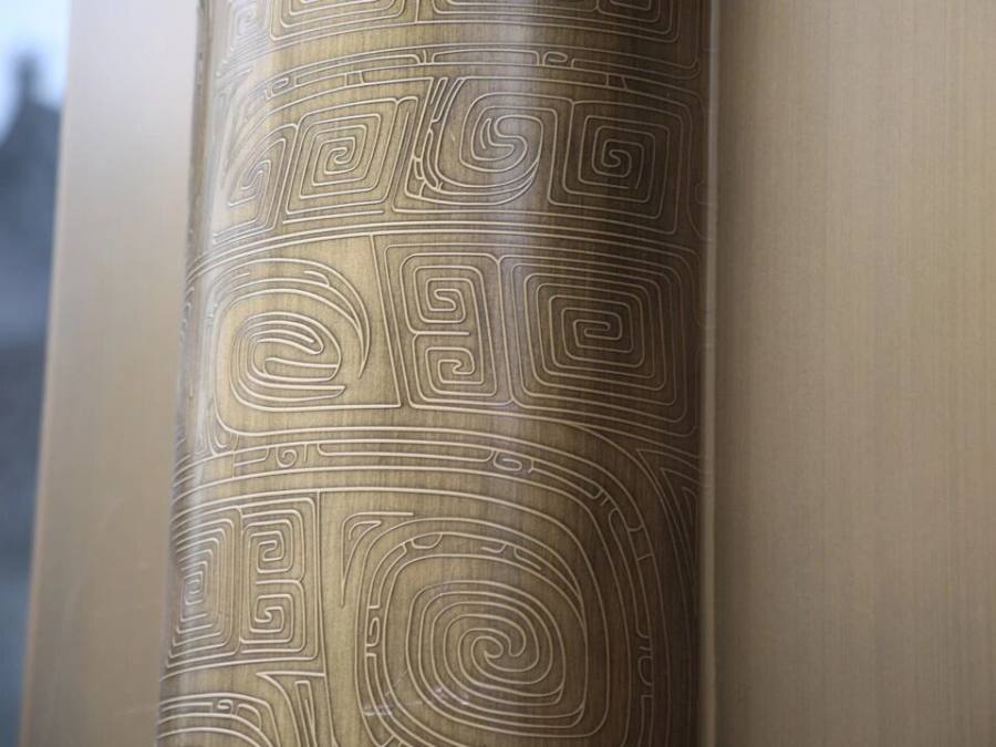 17号楼铝仿铜柱柱体纹饰取自河南洛阳出土的国宝级文物——商代兽面纹铜方鼎,纹饰以云雷纹为底,主纹为兽面纹,形象生动,层次分明。为了能够直观评判蚀刻图案的观感与整体效果,团队利用三维彩绘喷涂技术进行仿真打样,并在现场制作1:1 视觉样板,在加工阶段,通过调整酸腐蚀精确位置,达到不同纹路的深浅不一的效果,保证设计图案最优呈现。