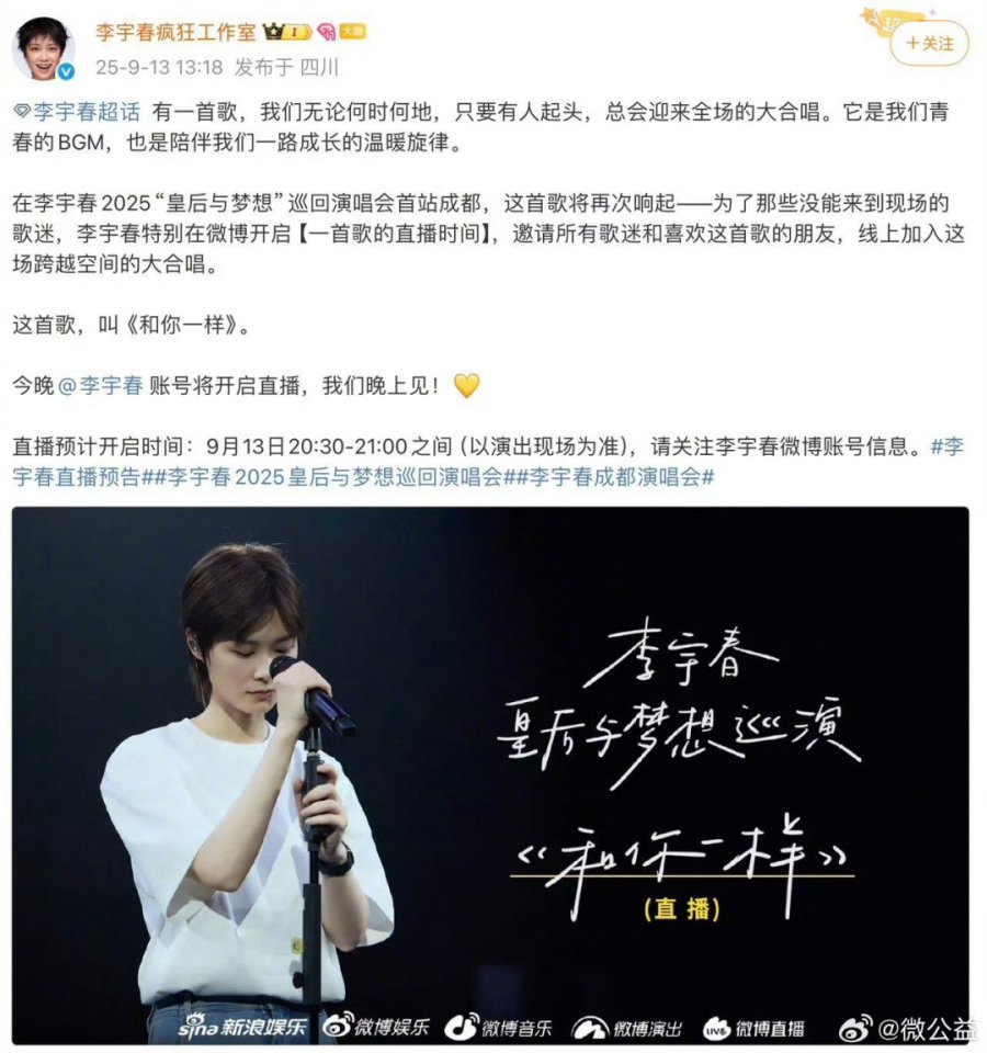直播正是实现这一转化的核心载体,也是行业主流的线上互动形式。例如,李宇春在巡演中为线上歌迷开设专属微博直播间合唱《和你一样》,拉近与非现场用户的距离;陈楚生在演出前以“云探班” 形式直播舞台搭建细节、分享创作灵感,甚至拆解伴手礼设计,满足用户沉浸式期待。