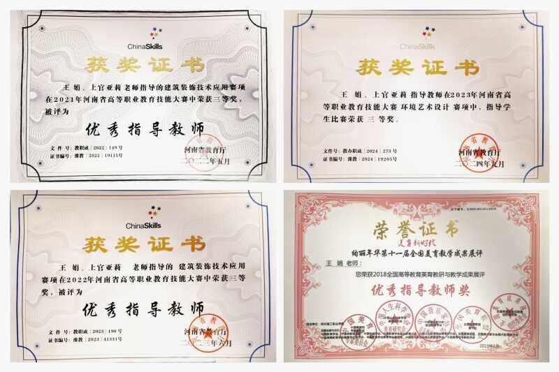 指导学生参加全国大学生广告艺术大赛、国青杯艺术设计大赛、绚丽年华全国高等教育美育教研与教学成果展评、第五届全国数字创意教学技能大赛、第十届未来设计师、“河南之星”设计艺术大赛、河南省高等职业教育技能大赛等各类国家级省级技能大赛,屡获佳绩,并多次被评为“优秀指导教师”。特别是在河南省高等职业教育技能大赛中,她带领学生连续三年荣获奖,展现出非凡的组织与指导能力。