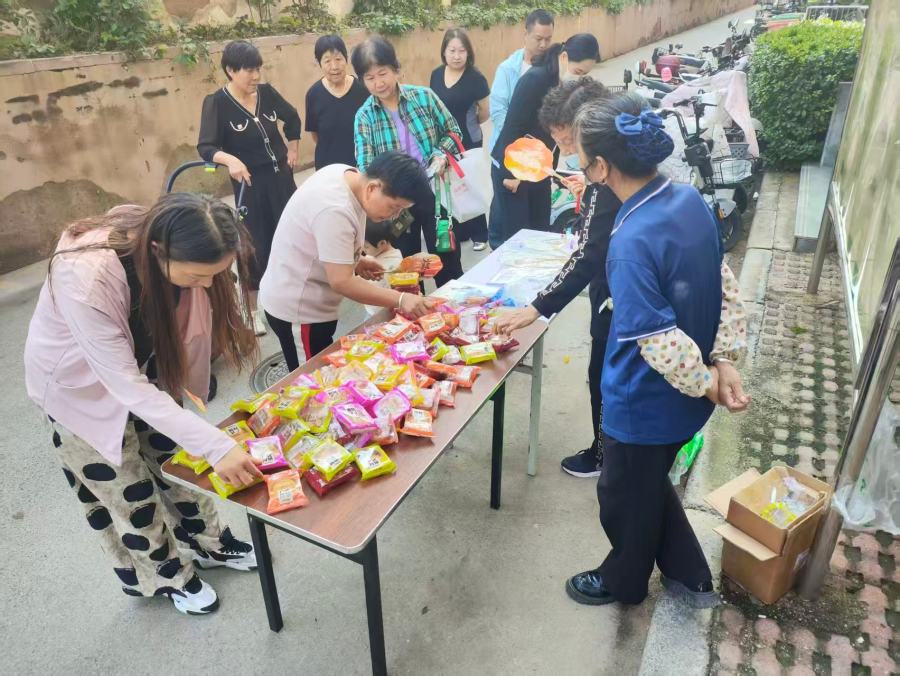 扇子DIY活动结束后,社区工作人员开始为在场居民分发中秋月饼。大家脸上都洋溢着幸福的笑容。居民们一边品尝着香甜的月饼,一边分享着生活中的趣事,现场充满了浓浓的节日氛围和邻里温情。