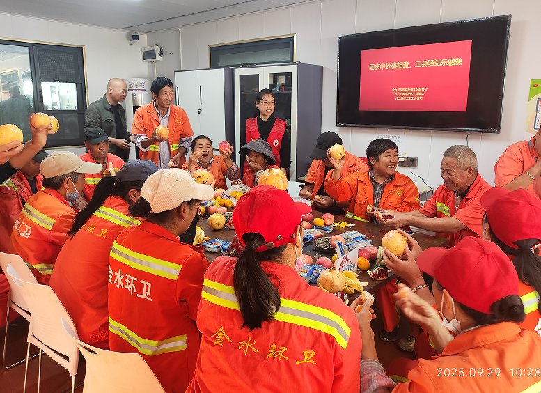 “香蕉祝日子香甜,苹果佑平安归家,石榴盼团结同心!”工作人员向劳动者们表达了节日祝福。温馨话语伴随着月饼的甜香,驱散了大家连日的辛劳。