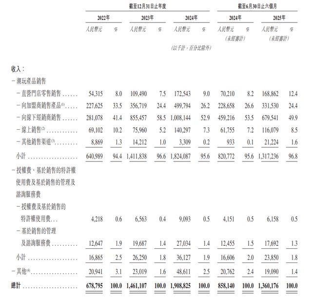 此外,与泡泡玛特收入基本来自直营不同,TOP TOY 大部分的收入来自加盟商和经销商,今年上半年的收入占比为 74.3% 。其中,名创优品既是 TOP TOY 持股86.9% 的大股东,又是 TOP TOY 最大的经销商,今年上半年贡献了 TOP TOY 45.5% 的收入。