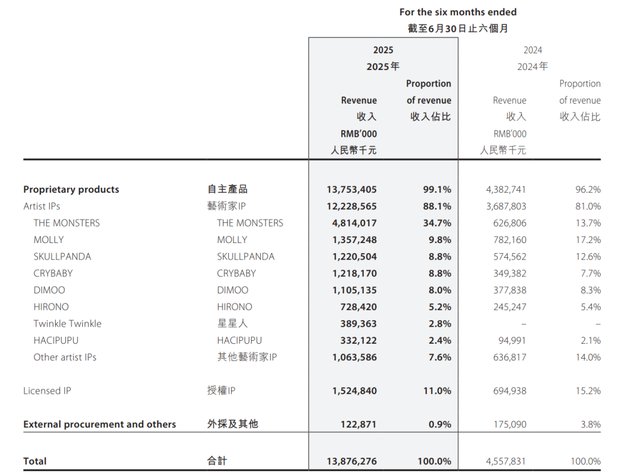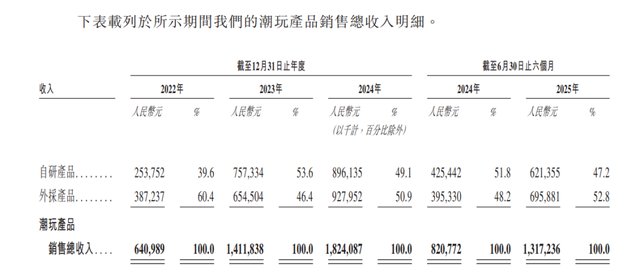 2025 年上半年,泡泡玛特的自主产品收入占总收入的比例为 99.1%,外采产品收入不到 0.9% 。