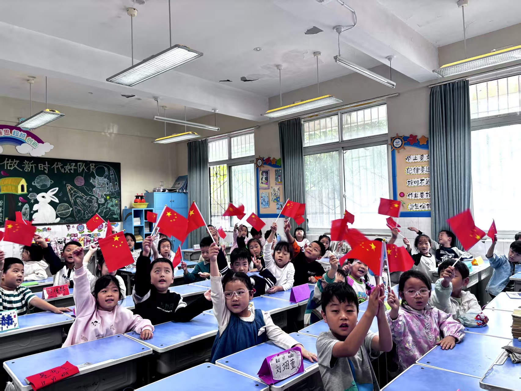 上午,校园内国旗飘扬,全体师生齐聚操场参加升旗仪式。伴随着雄壮的国歌声,五星红旗冉冉升起,师生们肃立注目,少先队员行队礼,崇敬与自豪之情在每个人心中激荡。升旗仪式后,“我与国旗合个影”活动温情开启,孩子们用一张张笑脸与国旗定格美好瞬间。各班同步开设“国旗知识小课堂”,详细讲解国旗的由来、象征意义及国旗法相关内容,尊重国旗,爱护国旗,强化国家意识与公民意识。