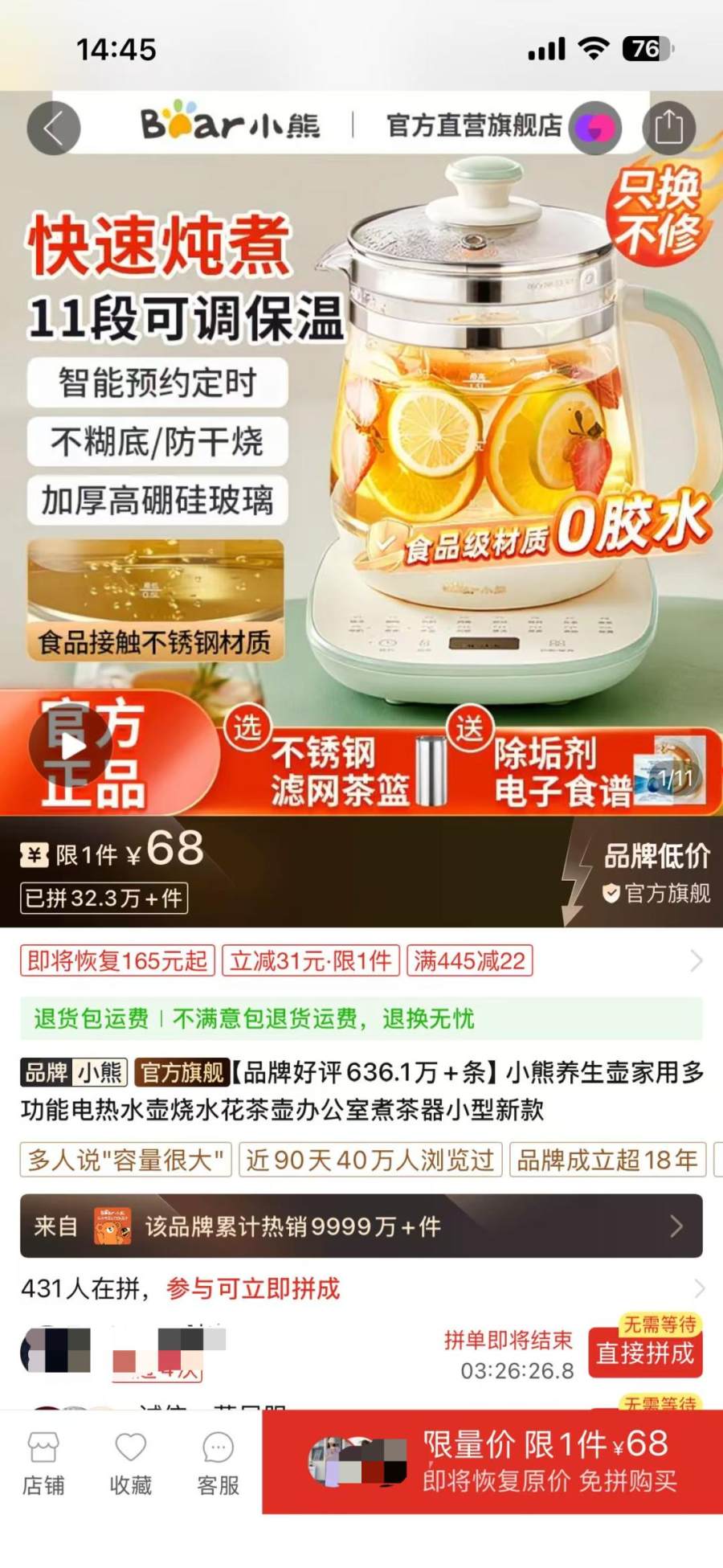 据悉,该型号产品在拼多多平台小熊家用电器官方旗舰店的售价为68元,销量高达30余万件,位居该店铺煎药壶年度畅销榜首位。