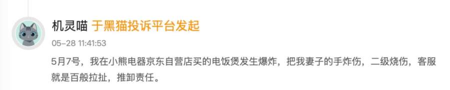 今年5月,又有消费者投诉称,他购买的小熊电饭煲发生爆炸,“把我妻子的手炸伤,二级烧伤,客服就是百般拉扯,推卸责任”。