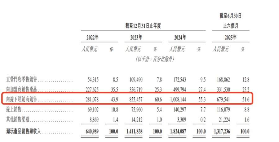 TOP TOY之所以能在渠道侧发展如此迅猛,离不开名创优品渠道供应链资源的助力。招股书显示,名创优品是其最大的销售渠道。2022年至2025年上半年,TOP TOY的营收中来自名创优品的收入分别达到2.49亿、7.81亿、9.22亿及6.19亿,占总收入比例为36.8%、53.5%、48.3%及45.5%。