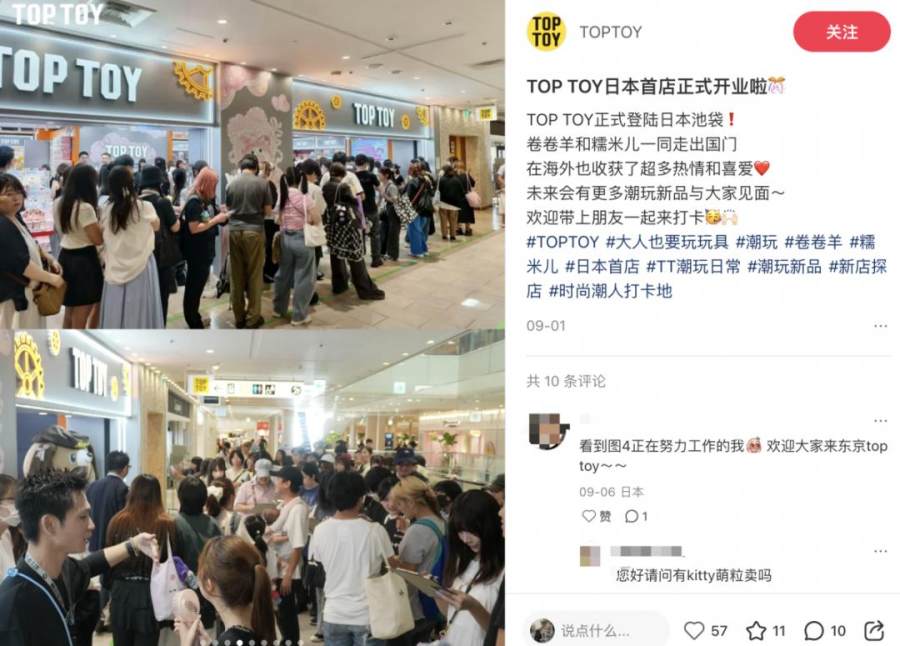 TOP TOY的出海步伐相当迅速,它没有局限于东南亚,已经进入了日本这样的成熟市场。在日本东京首店开业当日,销售额突破1100万日元(约53万元),自有IP Nommi糯米儿更是引发排队购买热潮。