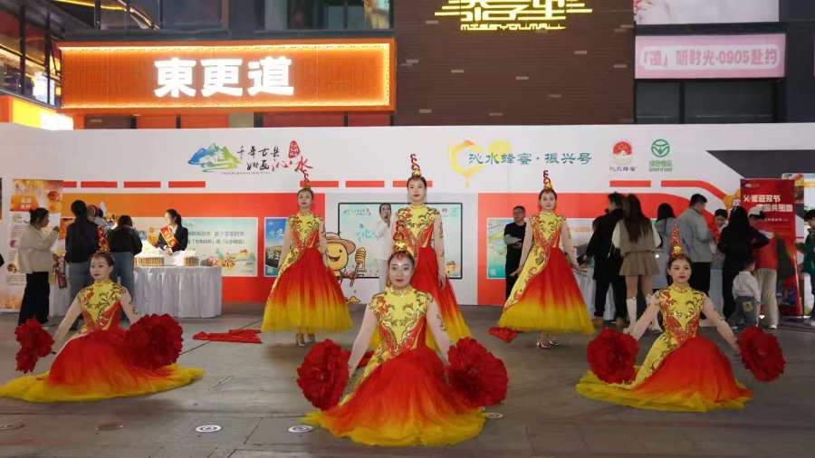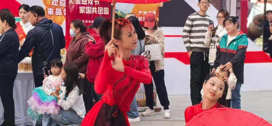 随着主持人激情饱满地对沁水蜂蜜的介绍和对活动的解说,现场参与的市民越来越多,期间为了营造喜迎国庆的氛围,热场舞蹈《桃花红》用灵动舞姿展现山西风情,紧随其后的《我们的旗帜》则以激昂旋律点燃家国情怀,台下观众纷纷鼓掌喝彩。