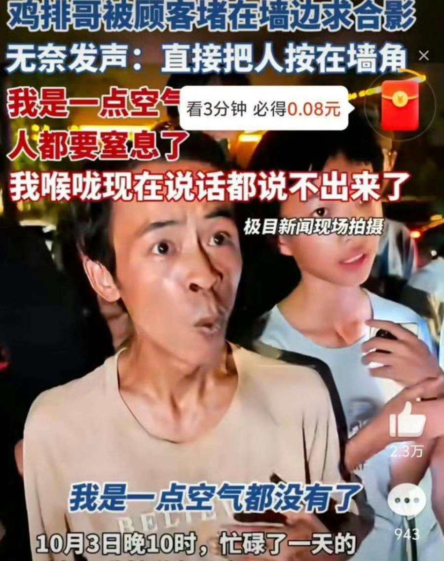 闻览焦点:这个国庆假期,因被游客层层围堵至墙角、呼吸困难而无奈发声的“鸡排哥”李俊永,用一句“我人都要窒息了”的感叹,为当下一种普遍的社会现象按下了紧急暂停键。这不仅仅是一个网红个体的偶然遭遇,更是一面镜子,映照出在流量与热度之下,公众行为失范所带来的安全隐患与人文缺失。