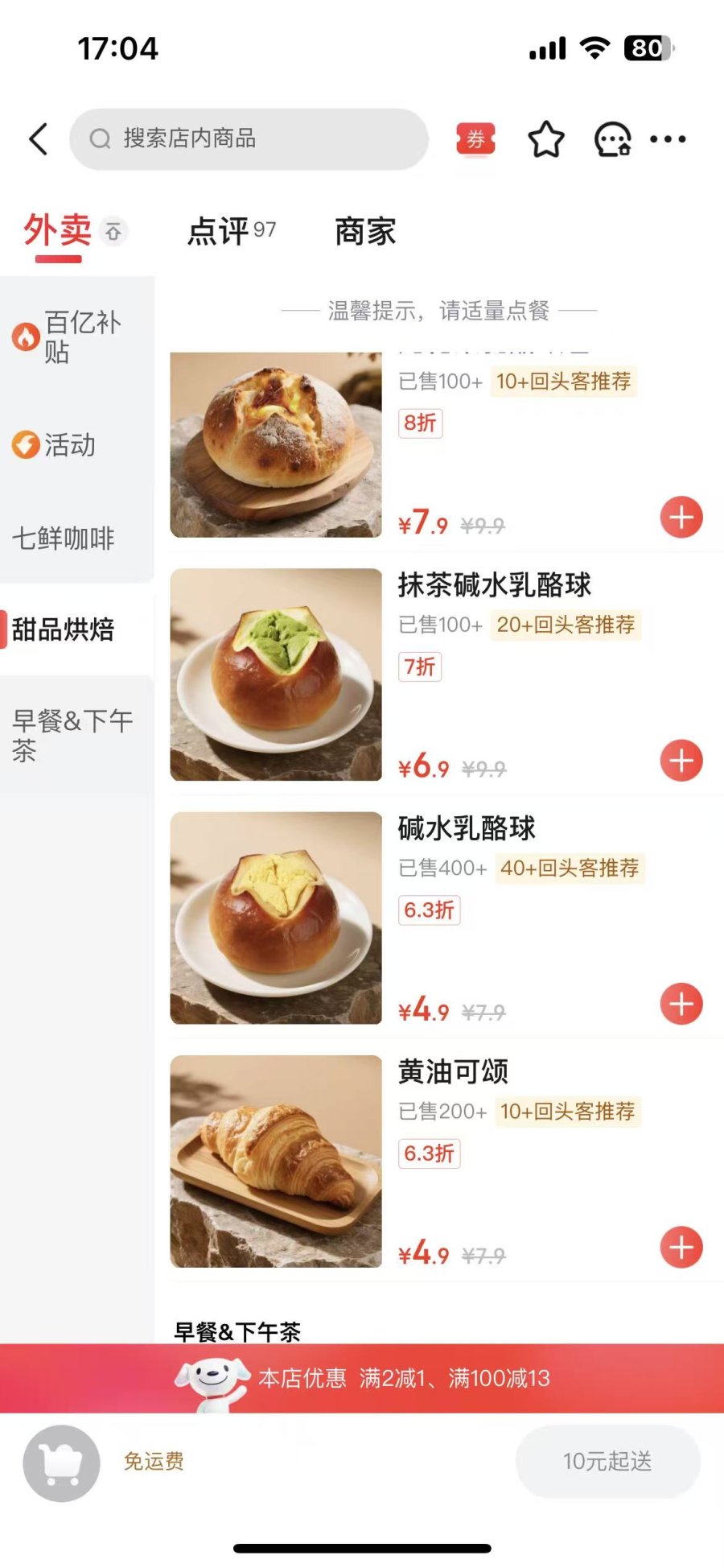 从产品看,七鲜咖啡的产品体系主要分:咖啡、甜品烘焙及早餐下午茶套餐,其中咖啡品类涵盖美式、拿铁等品类,分别有醇香美式、茉莉轻乳茶、轻椰茉莉冰茶、鲜奶拿铁、茉莉花香拿铁、生椰拿铁、椰青美式、双杯美式;甜品则有黄油提子司康、法式扁桃仁焦糖酥等热门烘焙面包产品。咖啡的定价仅为9.9元。但是在促销期间价格更低,只有5元到7元。比瑞幸和库迪更便宜。
