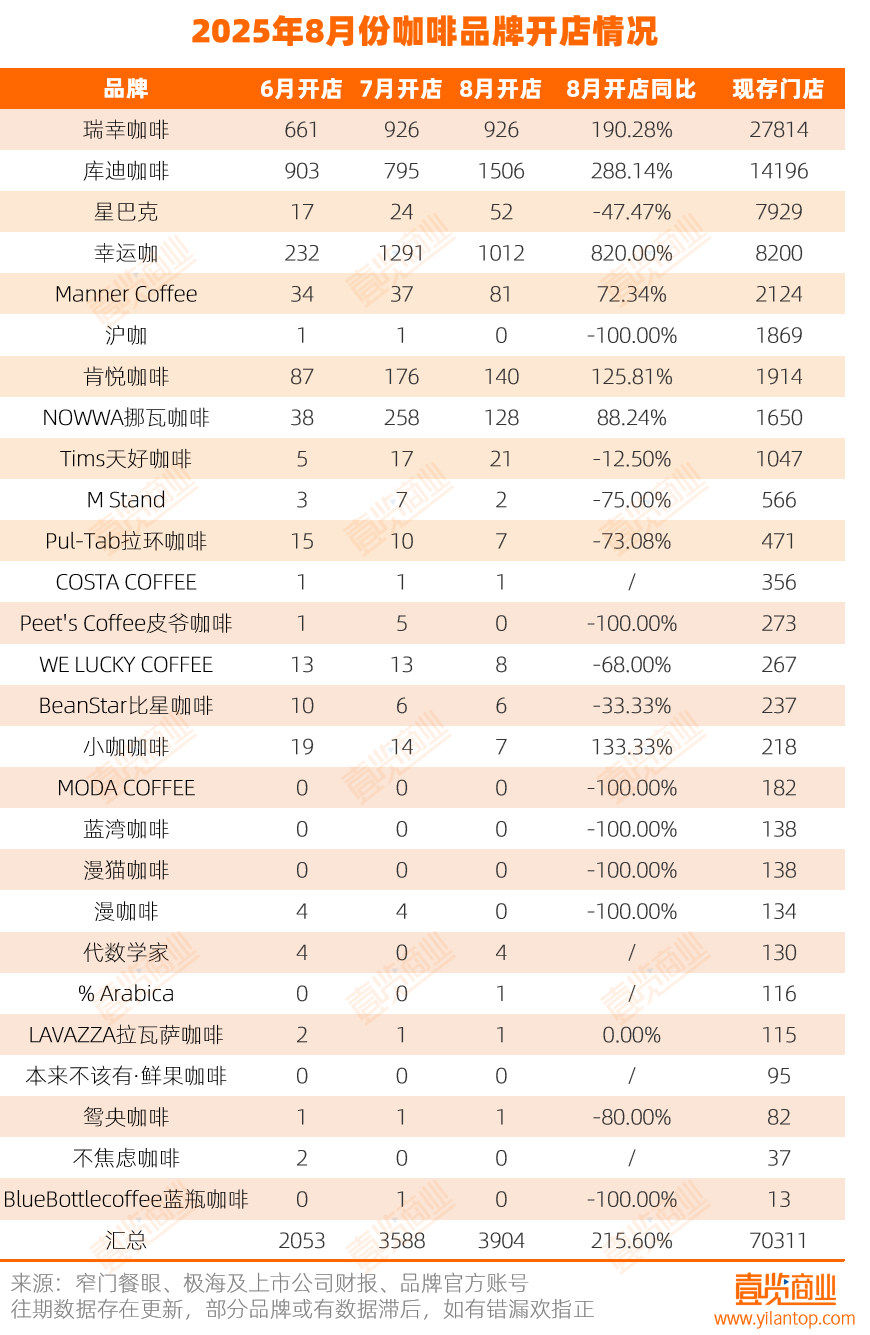 壹览商业数据显示,小咖咖啡6、7、8三个月分别开店19家、14家、7家,截至2025年8月底全国范围拥有门店218家。