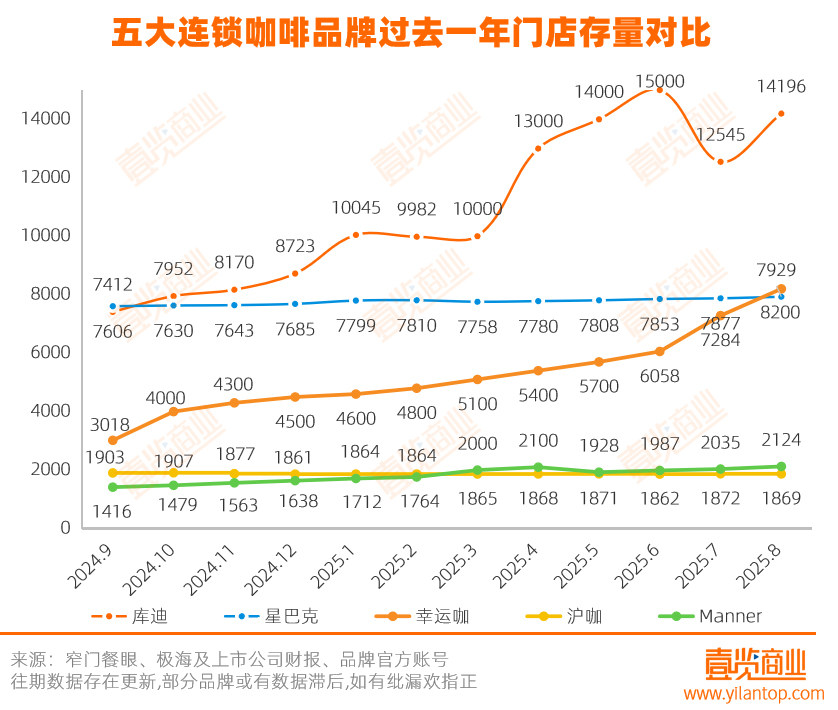 值得注意的是,据壹览商业数据,连锁咖啡行业门店门店分层明显,瑞幸、星巴克、库迪、幸运咖构成第一梯队,门店数量均超过7000家,马太效应持续加剧。其中,瑞幸咖啡以27814家门店断层领先,占总量的39.5%,规模壁垒稳固,并在高基数下保持稳健增长。库迪咖啡位居第二,门店数在1.5万家左右;幸运咖成功超越星巴克升至第三,印证其下沉策略的有效性。