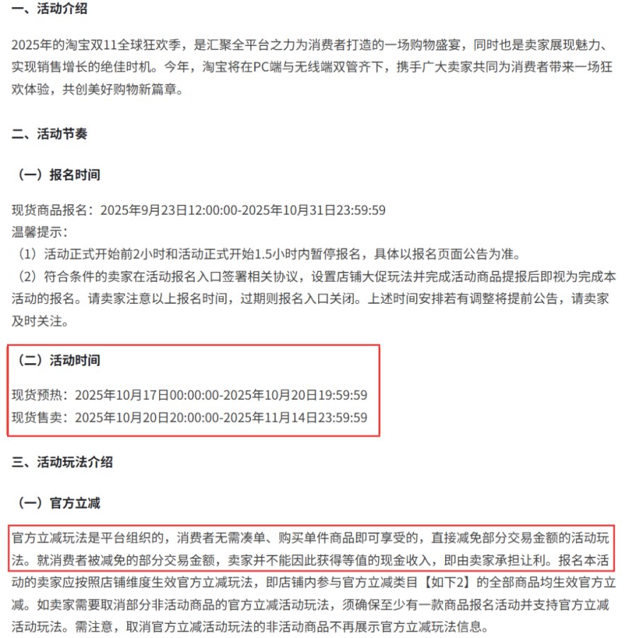淘宝、天猫的调整力度更为突出,取消了以往多轮预售与现货的复杂模式,将核心玩法聚焦为“官方立减”,即消费者无需凑单,购买单件商品即可享受直接减免部分交易金额。