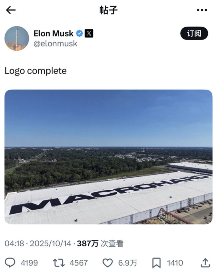 项目背后暗藏明确战略意图。屋顶喷涂的“MACROHARD”巨型标识,就是把微软英文名反着来的意思,被视作对微软的公开叫板。