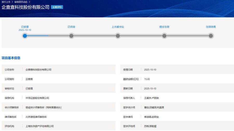 10月10日,上交所官网显示,企查查科技股份有限公司(下称“企查查”)的IPO申请获受理,拟于上交所主板挂牌上市,中信证券担任保荐人。