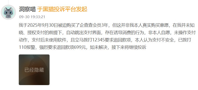 9月30日,一消费者投诉称,“存在诱导消费,误触界面后直接购买3600元两年会员,不予以退款”;9月30日,另一消费者表示,“我于2025年9月30日被迫购买了企查查会员3年,但这并非我本人真实购买意愿,在我并未知晓、授权支付的前提下,自动跳出支付界面,存在诱导消费的行为,非本人自愿,未操作支付动作,支付后未使用软件”。
