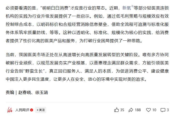 10月11日,人民网《“变美”之路不能成为“踩坑”之旅》一文也提到,新氧等部分轻医美连锁机构,通过低毛利策略与规模效应有效控制综合成本,以明码标价和合规经营消除信息壁垒,借助全流程可追溯与标准化服务体系筑牢质量防线等透明化、标准化、规模化为核心的实践,给消费者提供了性价比高的医美产品和服务,也为打破行业困局提供了一种思路。